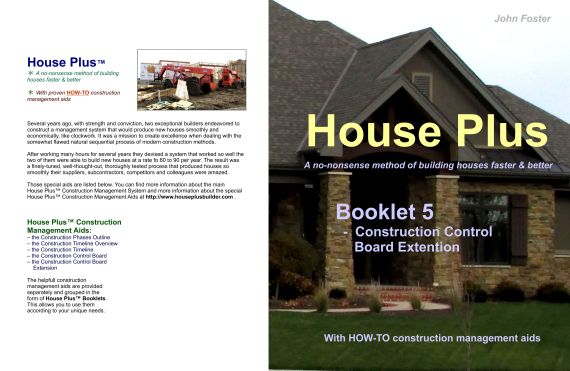 The House Plus™ Construction Management System was created by two exceptionally qualified builders to help other builders and construction managers build homes and other type buildings faster and better. To become familiar with the system, we recommend you purchase the main House Plus™ book. Then before you begin construction, we recommend you purchase Booklet 1 and Booklet 2 to become more familiar with the entire system. Booklet 1 and 2 include all construction interactive aids. Booklets 3,4, and 5 offer you additional aids as you need to manage additional houses or other type small buildings. Order Booklet 3, Booklet 4, and/or Booklet 5 as your needs require.
